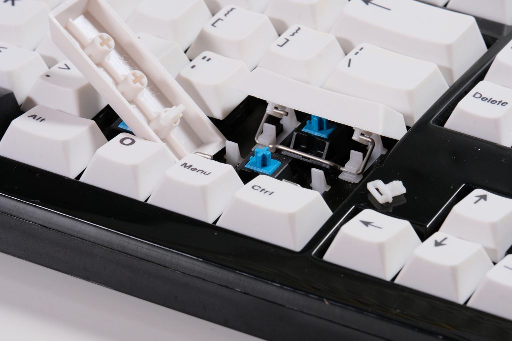 The Cherry design which acts more like a pair of switches tethered by a metal wire, with the stems attaching to a keycap that also attaches to the primary keyboard switch, likely in the center between the two stabilizer stems. With this structure, as the keycap is depressed and brought back up, the wire moving on one end also moves the other end, keeping both sides at just about the same height to avoid seesawing which, if you’ve never tried to press down a spacebar that is not stabilized, you probably should to get a pretty acute understanding of why that’s bad.